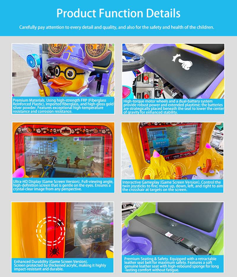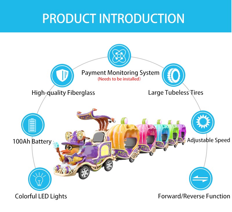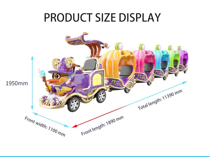 Elevate your seasonal events with the Magic Duck Halloween Express. This premium commercial trackless train combines the whimsical charm of a witch-themed IP with vibrant, multi-colored pumpkin carriages. Designed for high-traffic venues, it features integrated gaming monitors that allow children to play while they ride, ensuring longer stay times and repeat ticket sales. Crafted from high-strength FRP, this weather-resistant, interactive sightseeing ride is the perfect investment for malls and resorts seeking a unique Halloween attraction.