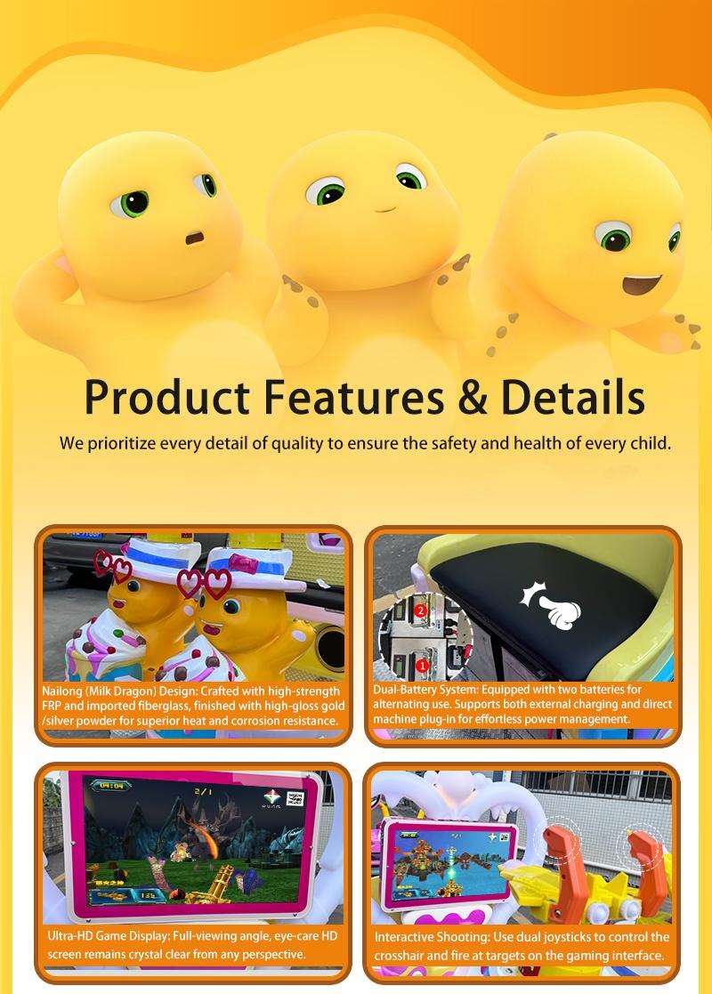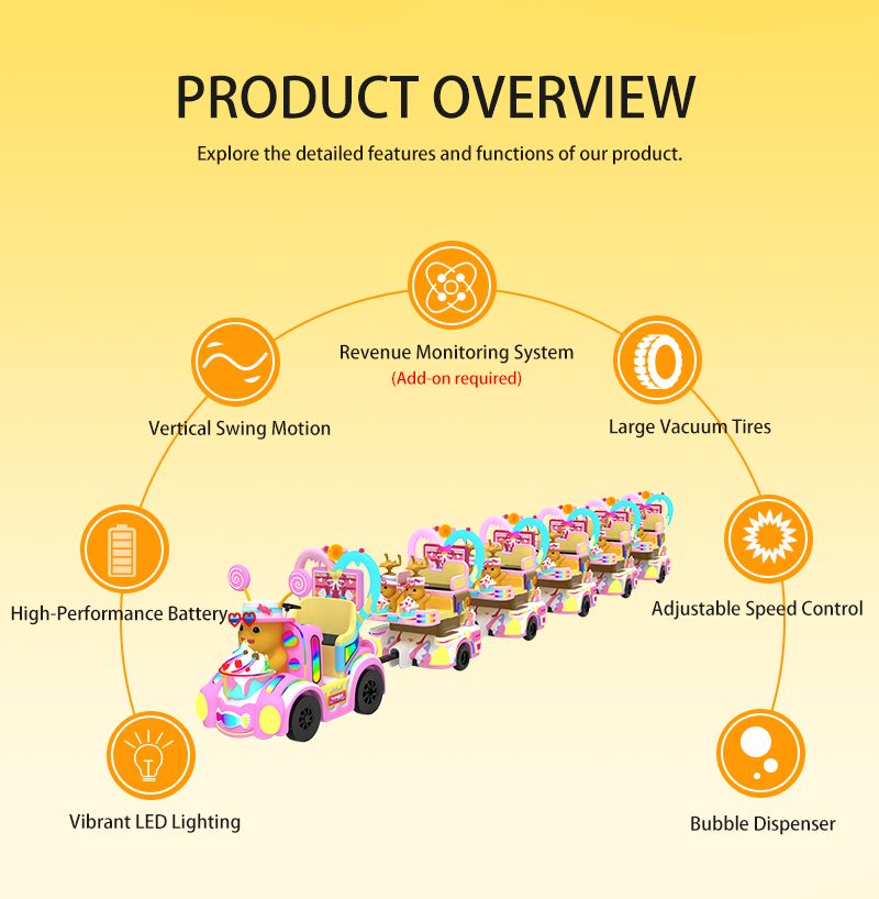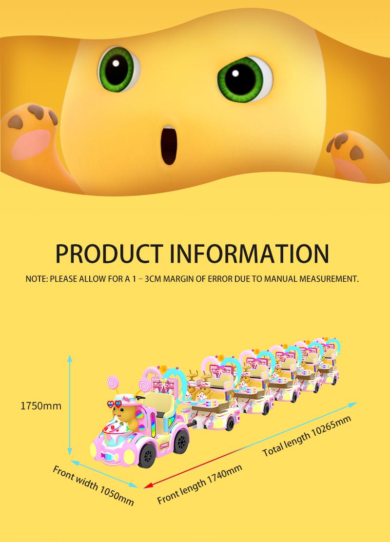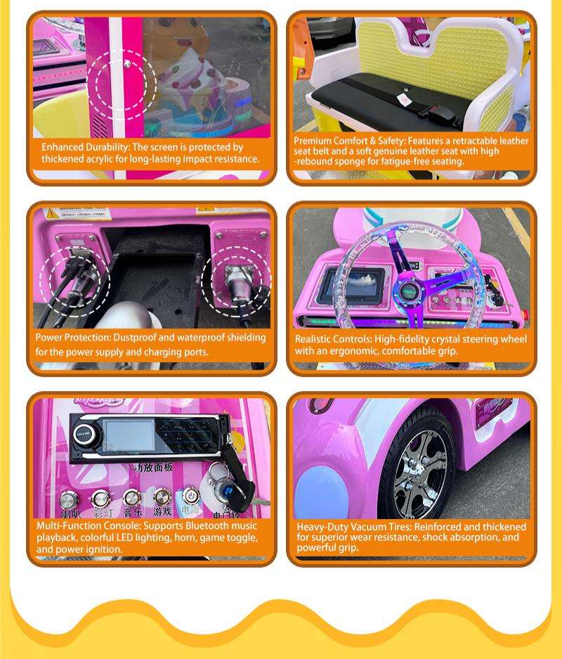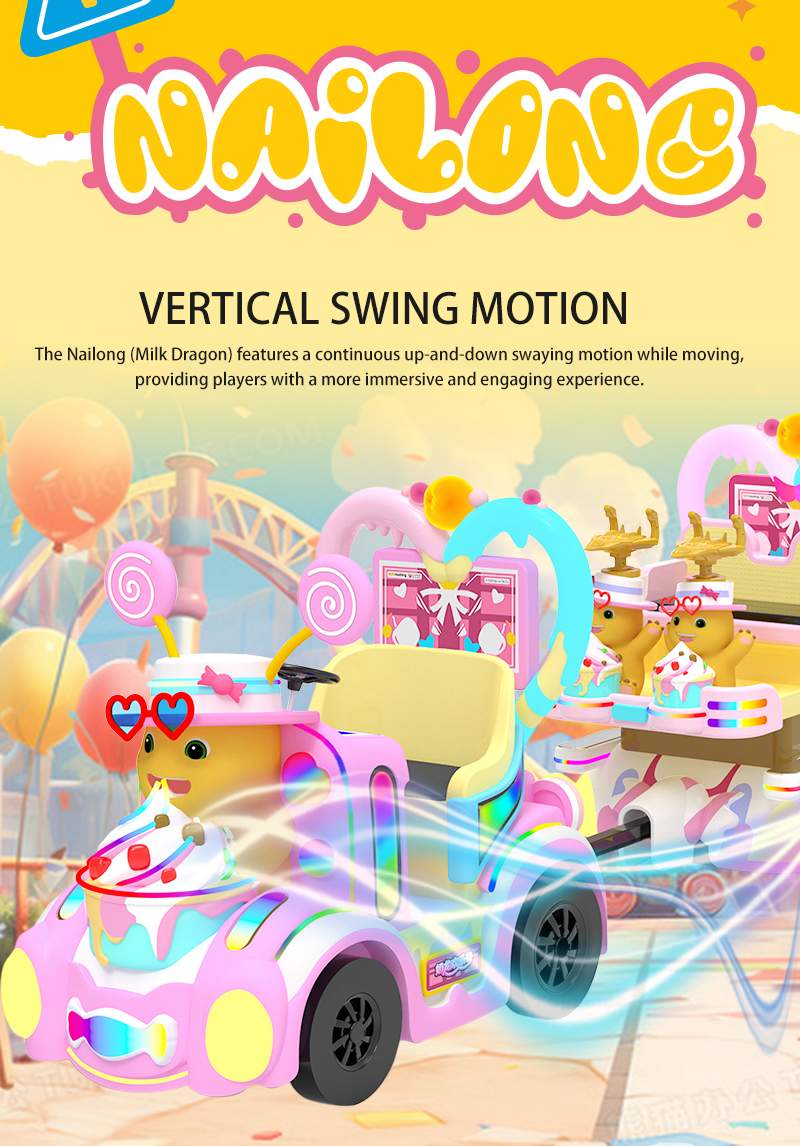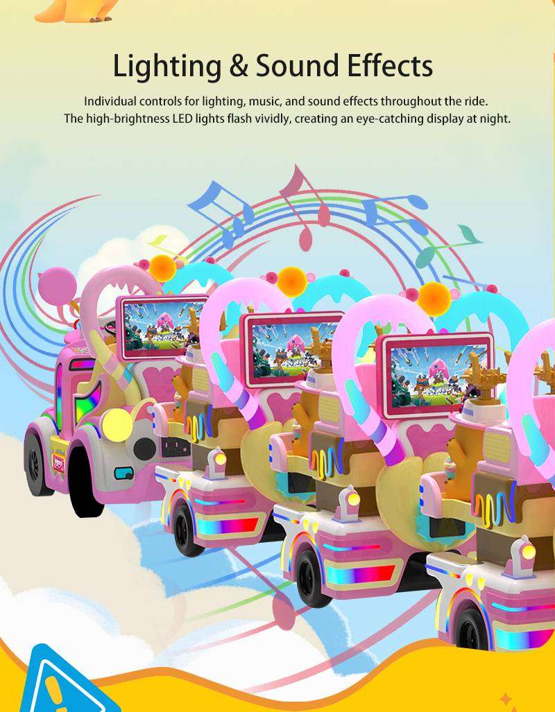 Transform your venue with the Nailong IP Motion-Interactive Candy Train, a masterpiece of “Dopamine Aesthetic” design. This commercial-grade trackless train sets a new standard with its industry-leading synchronized motion seats (up-down and front-back shaking), providing a 4D immersive experience for young passengers. The carriages are anchored by ultra-wide gaming screens framed in proprietary heart-shaped LED light strips, creating a stunning visual impact that attracts families instantly. Optimized for high ROI in shopping malls and FECs, this durable FRP-built system is where high-end technology meets irresistible IP appeal.